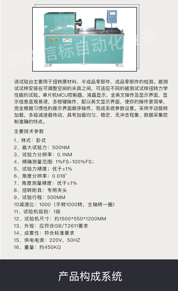 1、可以實現合格性試驗:判定扭矩扭角間的對應關系,觀察試驗是否變形、或是破壞 2、可以實現破壞性試驗:扭斷試驗,扭至試樣斷裂,求取峰值 三、產品構成系統: 1 試驗主機:采用臥式結構,高精度導軌+滑塊,剛性好,精度高。 2 傳動系統:由手動旋轉輪,多級減速機等組成。 3 測力系統:由高精度扭矩傳感器、美國AD芯片等組成。 4 顯示系統:試驗力測量系統由高精度負荷傳感器、測量放大器、A/D轉換、穩壓電源等組成;角度測量控制系統由光電編碼器、倍頻整形電路、計數電路等組成。通過各種信號處理,實現液晶顯示、及數據處理等功能。 5 安全保護裝置:滿量程過載時控制器有聲音報警。