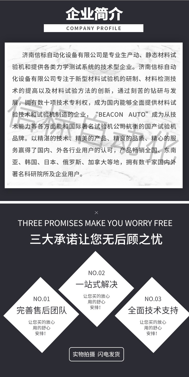 濟南信標自動化設備有限公司主要生產:動靜態萬能疲勞試驗機,接骨板彎曲試驗機,縫合線拉伸疲勞試驗機,髖膝關節磨損試驗機,電子萬能試驗機、液壓萬能試驗機、巖石三軸、四軸,電液拉力試驗機,材料試驗機,高低溫蠕變,高低頻疲勞,拉伸、扭轉、杯突等二十多個系列兩千多個的品種。