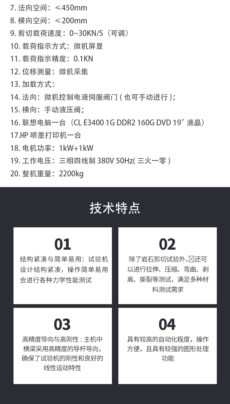 主要技術參數: ?法向載荷:0~500kN ?法向過載保護:超滿負荷2% ?法向工作行程S:0~100mm ?橫向載荷:0~300kN ?橫向過載保護:超滿負荷2% ?橫向工作行程S:0~150mm ?法向空間 : ≤450mm ?橫向空間 : ≤200mm ?剪切載荷速度:0~30KN/S(可調) ?載荷指示方式:微機屏顯 ?載荷指示精度:0.1KN ?位移測量:微機采集 ?加載方式: ?法向:微機控制電液伺服閥門(也可手動進行); ?橫向:手動液壓閥; ?聯想電腦一臺(CL E3400 1G DDR2 160G DVD 19”液晶) ?HP噴墨打印機一臺 ?電機功率:1kW+1kW ?工作電壓:三相四線制 380V 50Hz(三火一零) ?整機重量:2200kg ?外形尺寸:1500×900×1735mm Equipment working conditions設備工作條件: 1.Power supply(電源):Three phase and Four wire(三相四線制); three live wire, one zero line(三火線一零線) 2.Wiring definition(接線定義):Brown - live wire, Yellow - live wire, Blue - live wire,Black – zero line 棕-火線,黃-火線,藍-火線,黑-零線; 3.Main motor power(主機功率):2.2kW(千瓦) Total; 4.Max . Normal load (最大法向力):500kN(千牛); 5.Max. Lateral load(最大橫向/剪切力):300kN(千牛); 6.hydraulic oil(液壓油):46# Hydraulic Oil@cold area or season; 68# Hydraulic Oil@hot area or season; 46#抗磨液壓油@寒冷地區或季節;68#抗磨液壓油@炎熱地區或季節; oil bearing(耗油量):40L(公升); 7.Weight of machine(主機重量):about 2000kg;約2噸; 8.在無震動環境中。 9.電源電壓波動范圍小于額定電壓的±10%。 10.地基應平整、牢固。 試機: 1.加油:油液采用46#號抗磨液壓油,加油孔在儀器左后方,將左后方蓋板打開,將油箱上方加油口保護罩打開,加油即可,油量在40L左右。 2.接電:請牢固連接三相電源,不可缺相。
