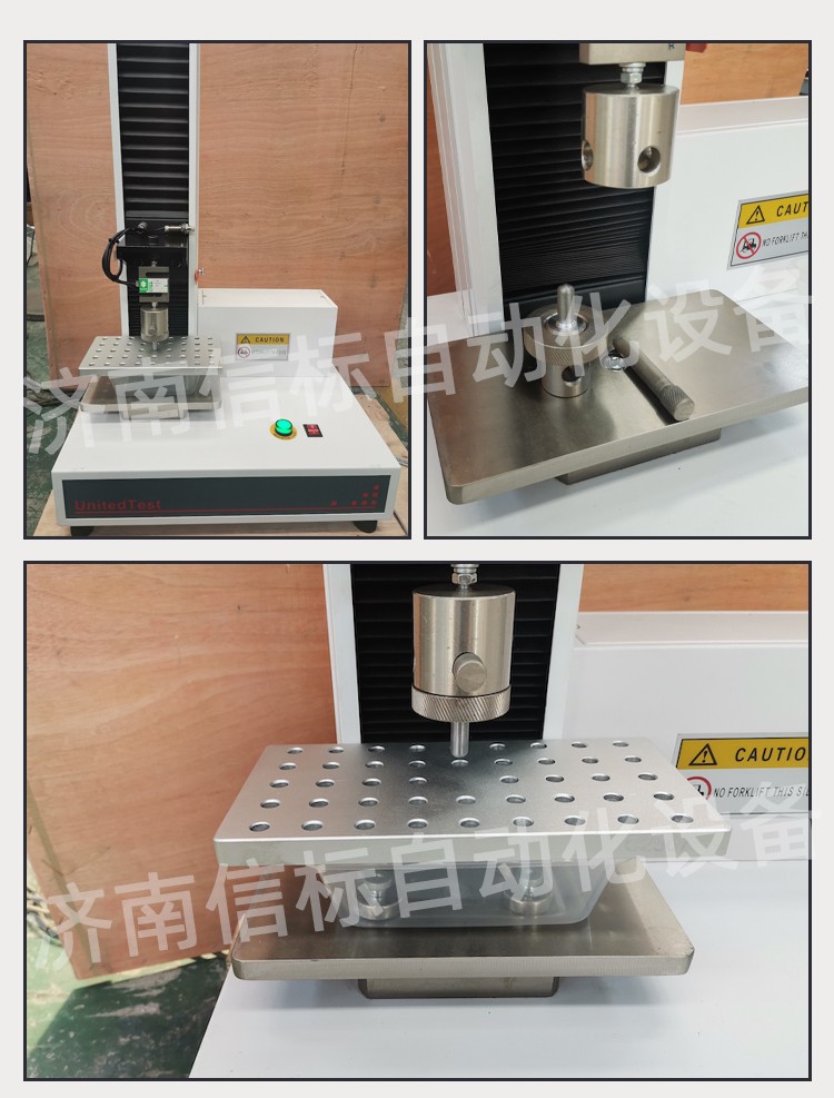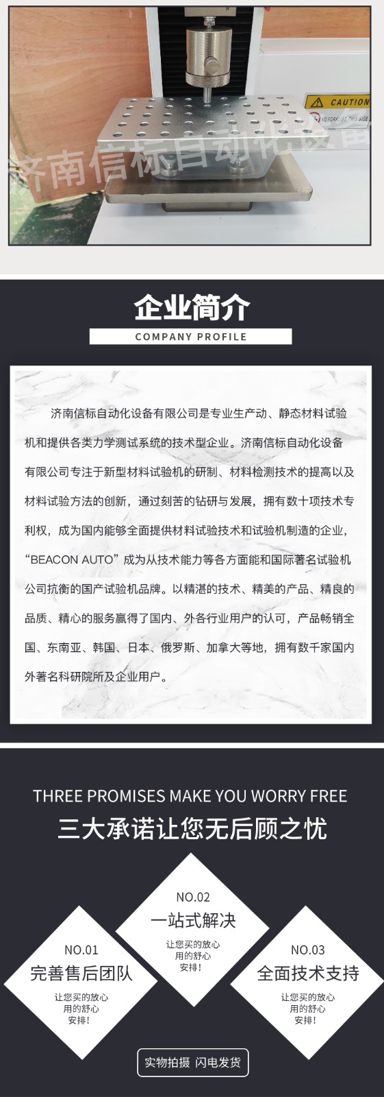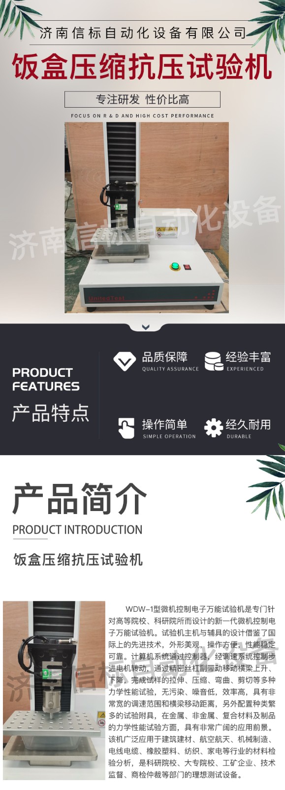 飯盒壓縮抗壓試驗機 單臂壓力萬能試驗機主要技術(shù)指標(biāo): 1、 最大試驗力: 100N/200N/500N/1KN/2KN/5KN 2、 測 量 范 圍: 最大試驗力的2%—100% 3、 試驗機精度級別:1級 4、 試驗力準(zhǔn)確度: 優(yōu)于示值的±1% 5、 橫梁位移測量: 分辨率為0.01mm 6、 變形準(zhǔn)確度: 優(yōu)于±1% 7、 調(diào) 速 范 圍: 0.05-500mm/min 8、 試 驗 空 間: 950mm 9、 主 機 形 式: 單臂式結(jié)構(gòu) 10、 主 機 尺 寸: 約600×420×1150 11、 重 量: 約90Kg 12、 工 作 環(huán) 境: 室溫~45℃,濕度20%~80% 飯盒壓縮抗壓試驗機 單臂壓力萬能試驗機主要功能及特點: 主機: 1.1調(diào)速系統(tǒng)采用伺服電機和自主研發(fā)減速系統(tǒng),性能穩(wěn)定可靠,具有過流、過壓、過載等保護(hù)裝置。調(diào)速范圍可達(dá)0.05~500mm/min。 1.2傳動部分采用圓弧同步齒形帶,精密絲杠副傳動,傳動平穩(wěn),噪音低,傳動效率高。 1.3萬向節(jié)采用十字插銷結(jié)構(gòu),而且具有擺角限制功能,一方面便于試樣夾持,保證試驗同心度,另一方面很好的消除了不規(guī)則試樣對傳感器的影響。 2、控制系統(tǒng)、操作軟件及數(shù)據(jù)處理系統(tǒng) 2.1計算機控制系統(tǒng),具有集成度高、性能穩(wěn)定、調(diào)整方便等優(yōu)點。可以對實驗數(shù)據(jù)進(jìn)行實時采集,對實驗特性曲線實現(xiàn)實時動態(tài)顯示,試驗數(shù)據(jù)文件能以Access常用數(shù)據(jù)庫或SQLserve大型數(shù)據(jù)庫的方式保存,方便實現(xiàn)客戶的資源共享及網(wǎng)絡(luò)管理,以及用戶的再分析。對于用戶自定義的各種word2000報表,該軟件可輕松實現(xiàn)訪問,解決了不同用戶或同一用戶在不同時期對試驗報表有不同需要的難題。該軟件可處理試驗力、位移、 時間、變形的原始數(shù)據(jù)及由此派生的曲線。