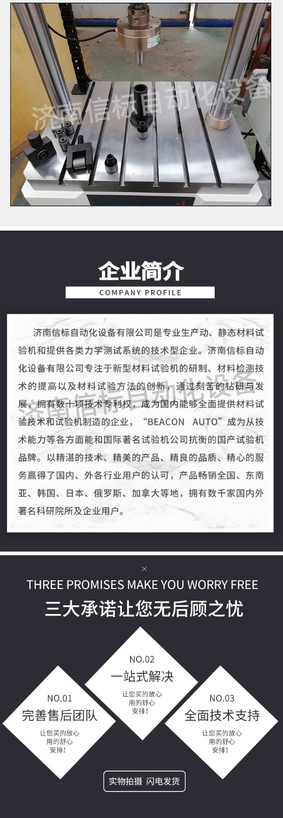 濟(jì)南信標(biāo)自動化設(shè)備有限公司主要生產(chǎn):動靜態(tài)萬能疲勞試驗(yàn)機(jī),接骨板彎曲試驗(yàn)機(jī),縫合線拉伸疲勞試驗(yàn)機(jī),髖膝關(guān)節(jié)磨損試驗(yàn)機(jī),電子萬能試驗(yàn)機(jī)、液壓萬能試驗(yàn)機(jī)、巖石三軸、四軸,電液拉力試驗(yàn)機(jī),材料試驗(yàn)機(jī),高低溫蠕變,高低頻疲勞,拉伸、扭轉(zhuǎn)、杯突等二十多個系列兩千多個的品種。