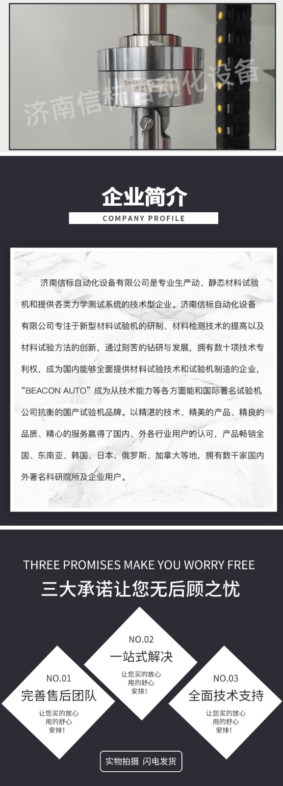 濟南信標自動化設備有限公司主要生產:動靜態萬能疲勞試驗機,接骨板彎曲試驗機,縫合線拉伸疲勞試驗機,髖膝關節磨損試驗機,電子萬能試驗機、液壓萬能試驗機、巖石三軸、四軸,電液拉力試驗機,材料試驗機,高低溫蠕變,高低頻疲勞,拉伸、扭轉、杯突等二十多個系列兩千多個的品種。