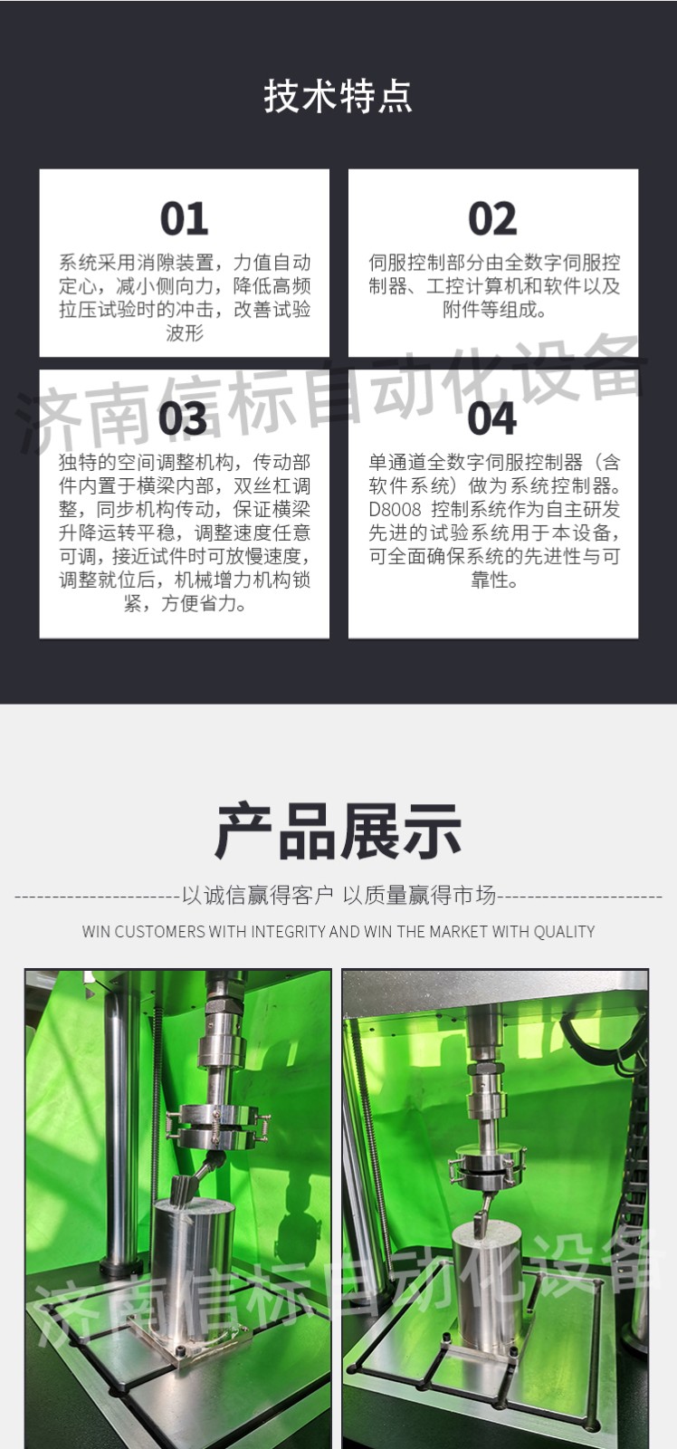 濟(jì)南信標(biāo)自動化設(shè)備有限公司主要生產(chǎn):動靜態(tài)萬能疲勞試驗機(jī),接骨板彎曲試驗機(jī),縫合線拉伸疲勞試驗機(jī),髖膝關(guān)節(jié)磨損試驗機(jī),電子萬能試驗機(jī)、液壓萬能試驗機(jī)、巖石三軸、四軸,電液拉力試驗機(jī),材料試驗機(jī),高低溫蠕變,高低頻疲勞,拉伸、扭轉(zhuǎn)、杯突等二十多個系列兩千多個的品種。