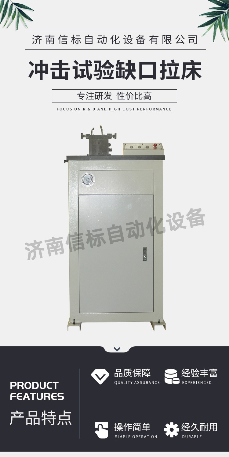 CSY-Y拉床為油泵液壓缸方式驅動,可按用戶要求而配置V 型或U 型拉刀,試樣缺口一次加工成型,一次可成功拉制兩個標準試樣缺口,拉刀采用特殊材料、特殊工藝精密加工制造,硬度高、耐磨性好,使用壽命長,加工出的V 型缺口和U 型缺口(2mm)可滿足GB/T229-2020相關國家標準,由于一次拉削加工成型的原理,其加工同一性極好,可保證所加工的試樣缺口百分之百合格。 三、技術特點: CSL-Y沖擊試驗缺口液壓拉床由液壓部分, 主傳動部分,電控部分,輔助部分等組成。 液壓部分由油箱、電機、泵、油缸等組成,主電機帶泵順時針旋轉吸油,供油缸以2.0m/min的速度帶刀體(V型、U型專用拉刀)上下運動拉削V型及U型缺口。刀座上設有潤滑油杯,工作時向油杯內加滿潤滑油(30#機油或其他潤滑油)。切削前后用刷子蘸少量油刷去鐵屑潤滑刀刃,切削前一定用刷子將鐵屑清除干凈。油缸下有接油盒,接流下的少量潤滑油。可以根據本機工作時間的長短定期清理 四、技術指標: 加工試樣缺口類型:V型,U型(2mm) 油缸行程:≥340mm 加工試樣尺寸:10×10×55 拉削速度調整:1-3m/min 拉刀行程:340 mm 拉刀材質:W6Mn5Cr4V2 可切削試樣硬度:≤30HRC 五、設備配置: 缺口自動拉床主機 1臺 拉刀及導向裝置 1套 試樣固定裝置 2套 油缸及連接部件 1套 潤滑噴淋系統 1套 10MPa油源動力系統 1套 電氣及控制系統 1套 防護系統(帶開門斷電) 1套 產品合格證 1套 產品使用說明書 1套 產品使用說明書 1套 液壓系統配件 1套