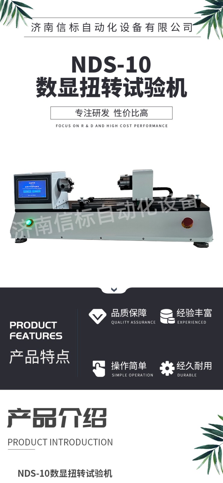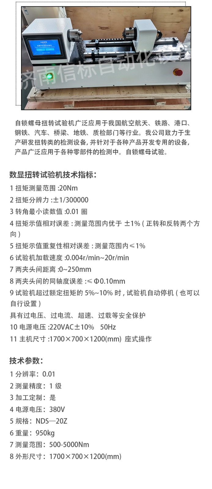 數(shù)顯扭轉試驗機技術指標: 1 扭矩測量范圍:20Nm 2 扭矩分辨力:±1/300000 3 轉角最小讀數(shù)值:0.01圈 4 扭矩示值相對誤差:測量范圍內優(yōu)于±1% (正轉和反轉兩個方向) 5 扭矩示值重復性相對誤差:測量范圍內≤1% 6 試驗機加載速度:0.004r/min~20r/min 7 兩夾頭間距離:0~250mm 8 兩夾頭間的同軸度誤差:≤Φ0.10mm 9 試驗機超過額定扭矩的5%~10%時,試驗機自動停機(也可以自行設置) 具有過電壓、過電流、超速、過載等安全保護 10 電源電壓:220VAC±10% 50Hz 11 主機尺寸:1700×700×1200(mm) 座式操作 功能特點: 1、適用于WINDOWS平臺的中文試驗軟件,實現(xiàn)試驗數(shù)據(jù)采集處理。 2、可實時采集試驗數(shù)據(jù)、運算處理、實時顯示并打印結果報告。 3、曲線遍歷:可用鼠標對曲線數(shù)據(jù)逐點訪問,以便求取各種數(shù)據(jù)。扭矩與扭角關系曲線中能反映任意點扭矩—角度的關系,能方便地在曲線上找到所求數(shù)據(jù)點;可方便地對曲線局部放大還原等。 4、根據(jù)需要可隨時對扭矩、角度測量通道進行手動或自動清零。 5、自動存盤:試驗條件、試驗數(shù)據(jù)自動存盤,需要時可隨時調出。 6、批量試驗:試驗條件設定后,可依次完成一批樣品的試驗,試驗條件、試樣參數(shù)、測試數(shù)據(jù)、結果可存儲,隨時調用,再次試驗無須設置。 7、打印試驗報表。