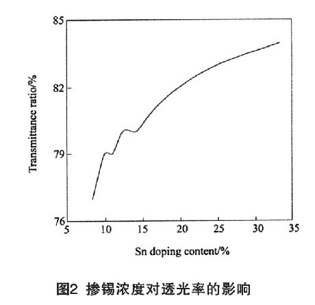 圖2為摻雜濃度對(duì)ITO薄膜透光率(λ=550nm)的影響關(guān)系曲線(xiàn)。ITO薄膜透光率隨著錫摻雜濃度增加,逐漸增大,ITO薄膜中錫離子含量的增加有利于提高ITO薄膜的透光率。