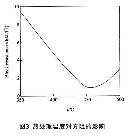 圖3為熱處理溫度對(duì)ITO薄膜的方阻影響關(guān)系曲線(xiàn)。熱處理溫度較低時(shí)ITO薄膜方阻較高,隨著熱處理溫度的增加ITO薄膜的方阻直線(xiàn)下降,熱處理溫度達(dá)到450℃時(shí)ITO薄膜方阻降為最低,熱處理溫度高于450℃后ITO薄膜方阻由減小轉(zhuǎn)為增加。熱處理溫度較低時(shí),ITO薄膜晶粒較小,方阻較大;隨著熱處理溫度的升高,ITO薄膜晶粒增大,有利于方阻的下降;當(dāng)熱處理溫度接近500℃附近時(shí)晶格畸變嚴(yán)重,抵消了晶粒增大有利于方阻下降的影響,導(dǎo)致熱處理溫度超過(guò)450℃后,ITO薄膜方阻轉(zhuǎn)為增加。