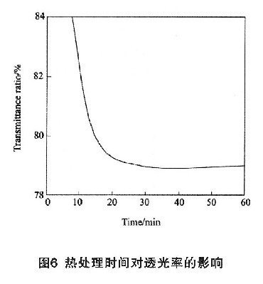 圖6為熱處理時(shí)間對(duì)ITO薄膜透光率(λ=550nm)的影響關(guān)系曲線(xiàn)。熱處理時(shí)間較短時(shí)ITO薄膜透光率較高,隨著熱處理時(shí)間的增加,ITO薄膜透光率隨之減小,當(dāng)熱處理時(shí)間超過(guò)15min后,隨著熱處理時(shí)間的增加,ITO薄膜的透光率下降緩慢,熱處理時(shí)間超過(guò)30min后ITO薄膜的透光率基本不隨著熱處理時(shí)間的增加而變化。