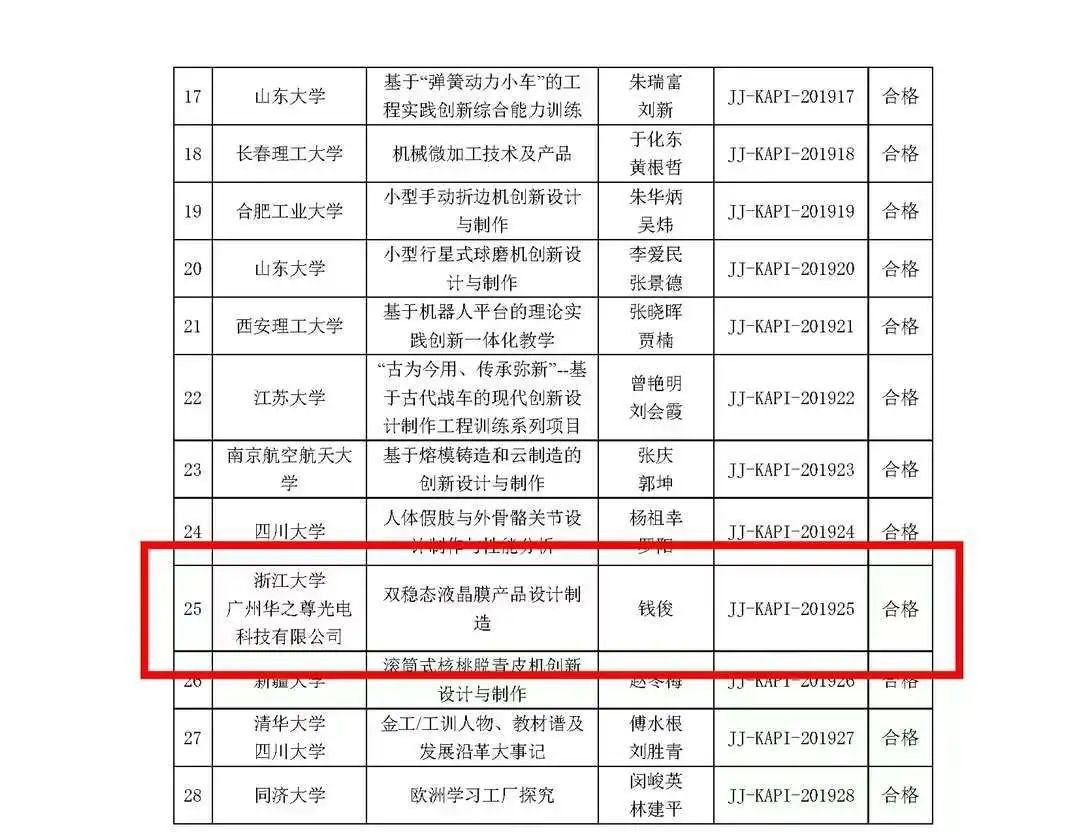 經(jīng)教育部機(jī)械基礎(chǔ)課程教學(xué)指導(dǎo)分委員會研究決定,于2022年1月對 2019KAPI一體化培養(yǎng)方法教學(xué)研究項目進(jìn)行結(jié)題驗(yàn)收。經(jīng)過專家組對提交的教學(xué)研究項目結(jié)題資料進(jìn)行審查和評審,同時經(jīng)教指委審核批準(zhǔn)。浙江大學(xué)和廣州華之尊光電科技有限公司的KAPI一體化培養(yǎng)項目“激光精密加工與新材料、新技術(shù)、新工藝的綜合應(yīng)用實(shí)踐—雙穩(wěn)態(tài)液晶膜產(chǎn)品設(shè)計制造”順利結(jié)題驗(yàn)收。