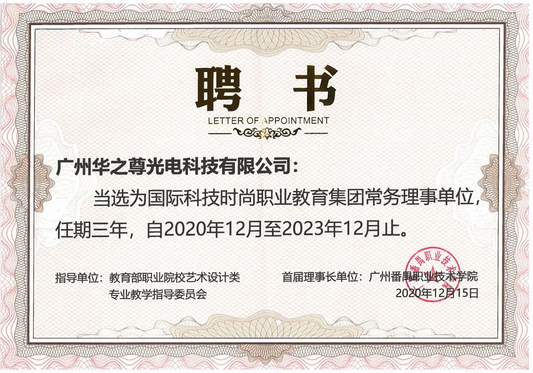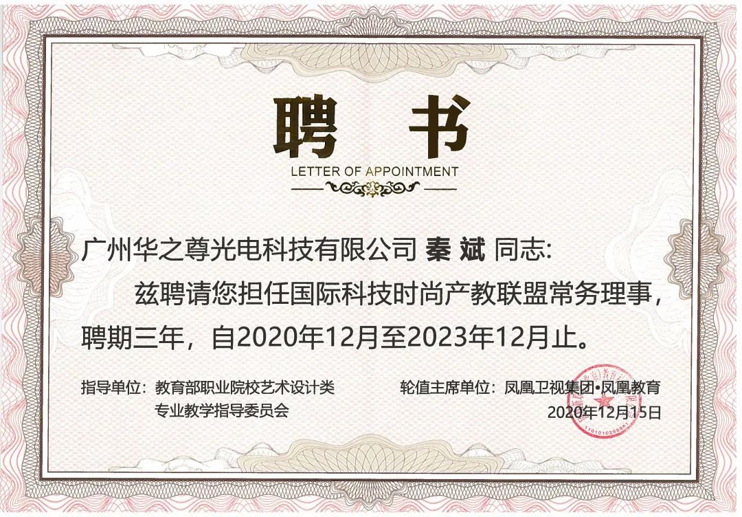 教育向善,共生未來!世界因你而溫暖!廣州華之尊光電科技有限公司榮獲國際科技時尚職業(yè)教育集團常務(wù)理事單位。華之尊激光秦斌總經(jīng)理榮獲“雙高”建設(shè)項目——廣州番禺職業(yè)技術(shù)學院設(shè)計專業(yè)群建設(shè)指導委員會委員、國際科技時尚產(chǎn)教聯(lián)盟商務(wù)理事。